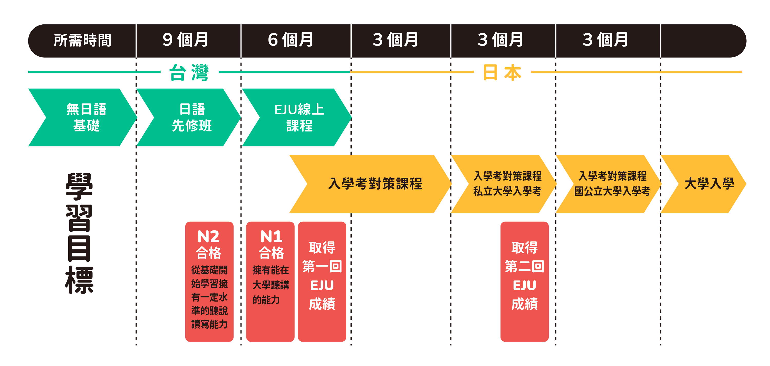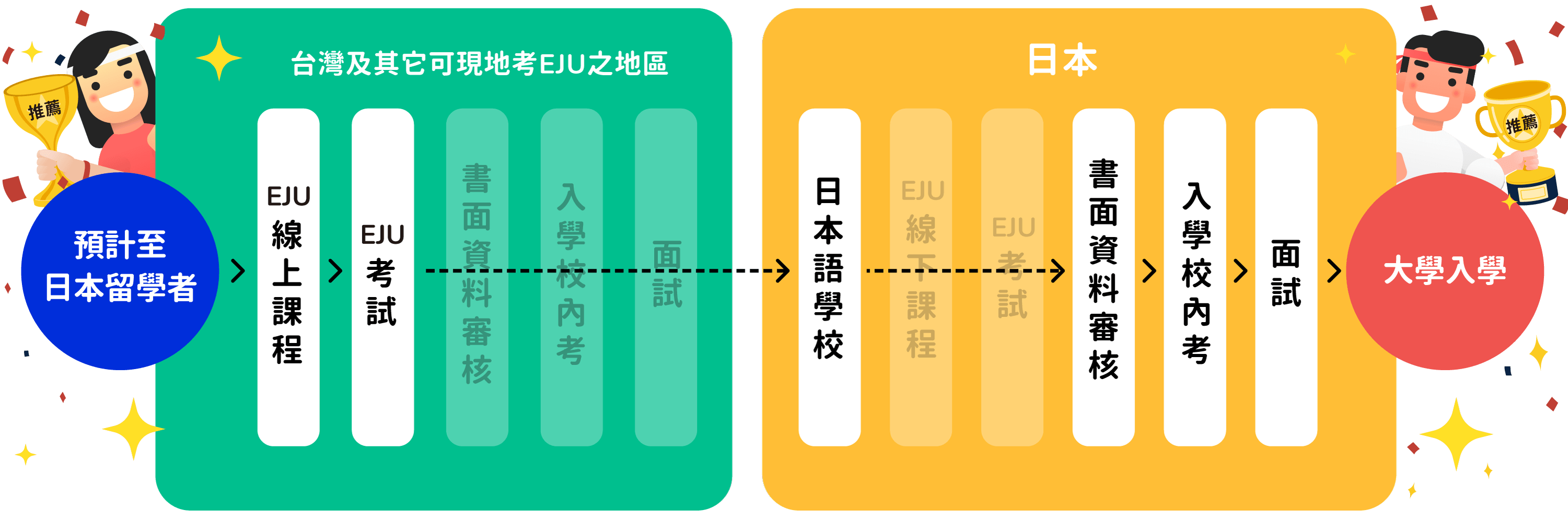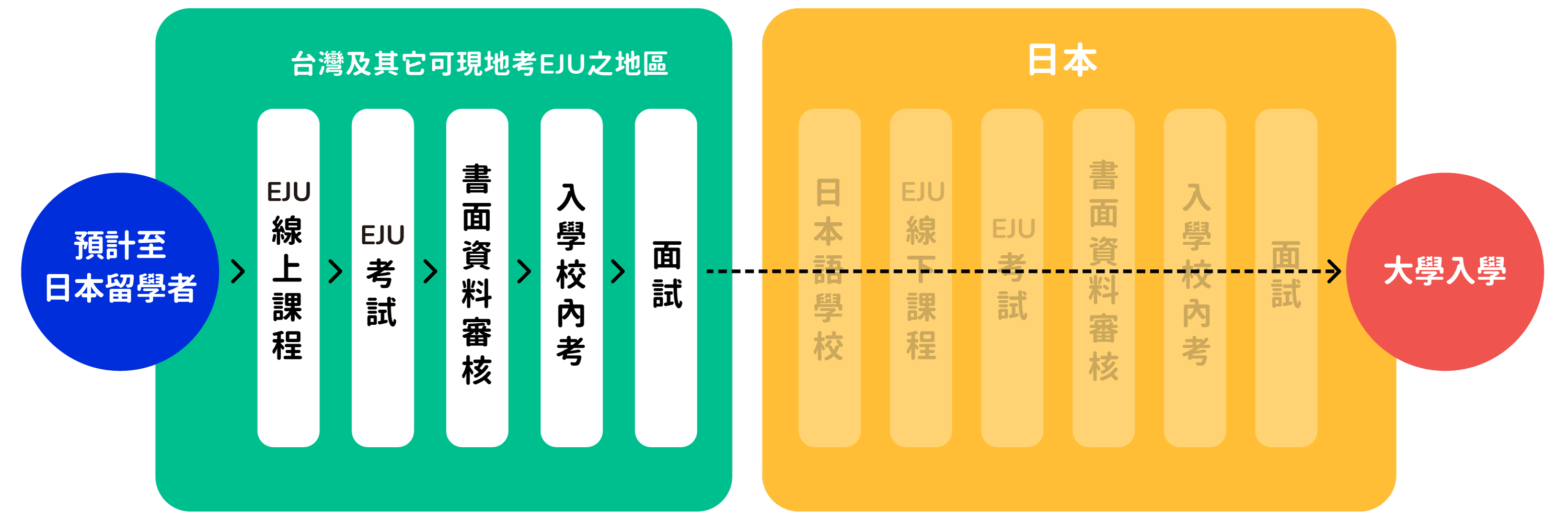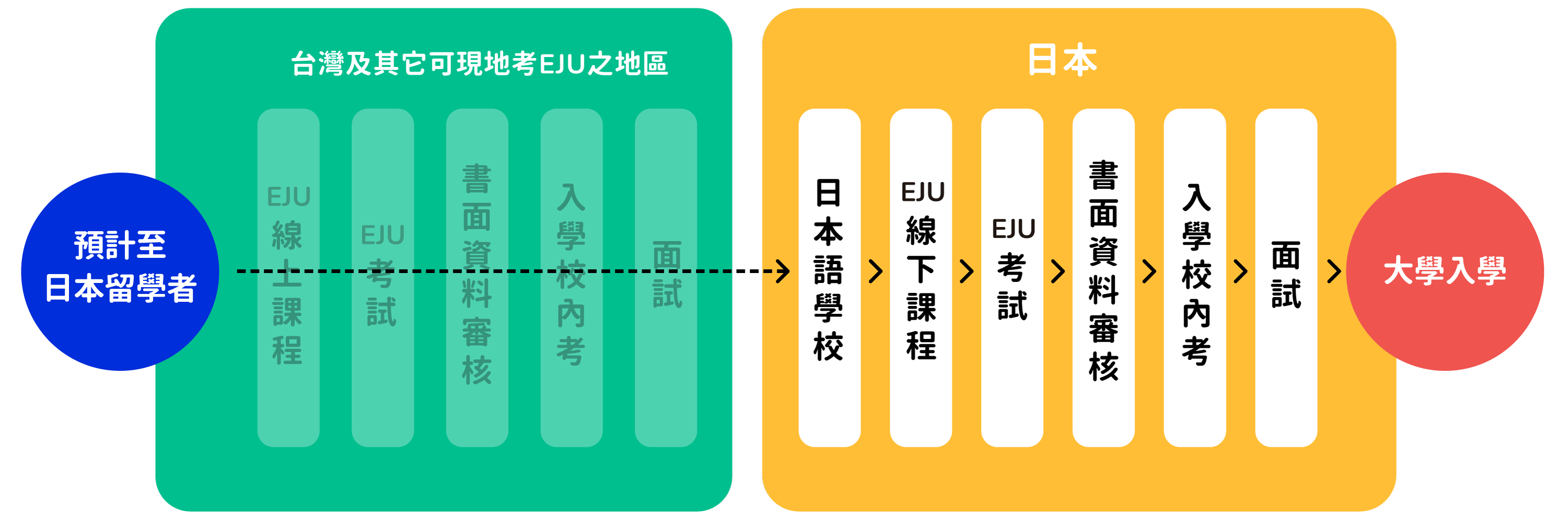 需經過語言學校、EJU課程、EJU考試、書面資料審核、入學校內考、面試等流程。