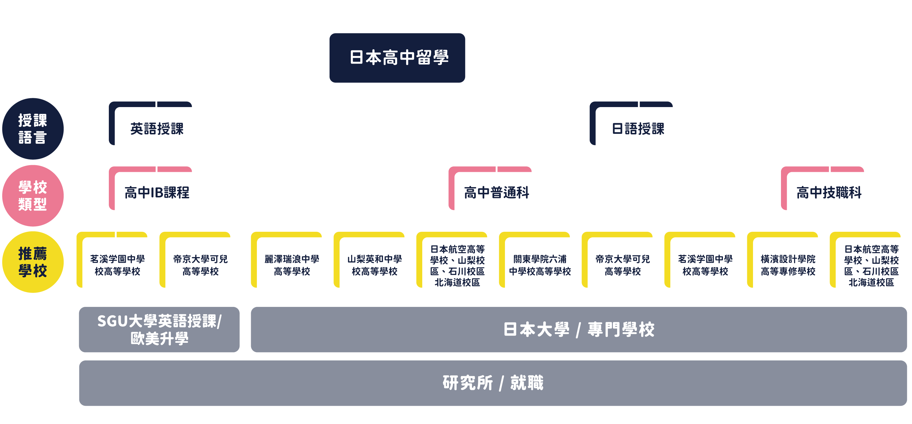 重視學生個性與創造性,不以成績為唯一判斷,有專門學校、短大、專門職大學、大學、SGU等多元升學路徑與學習方式,能依喜好與專長發展。